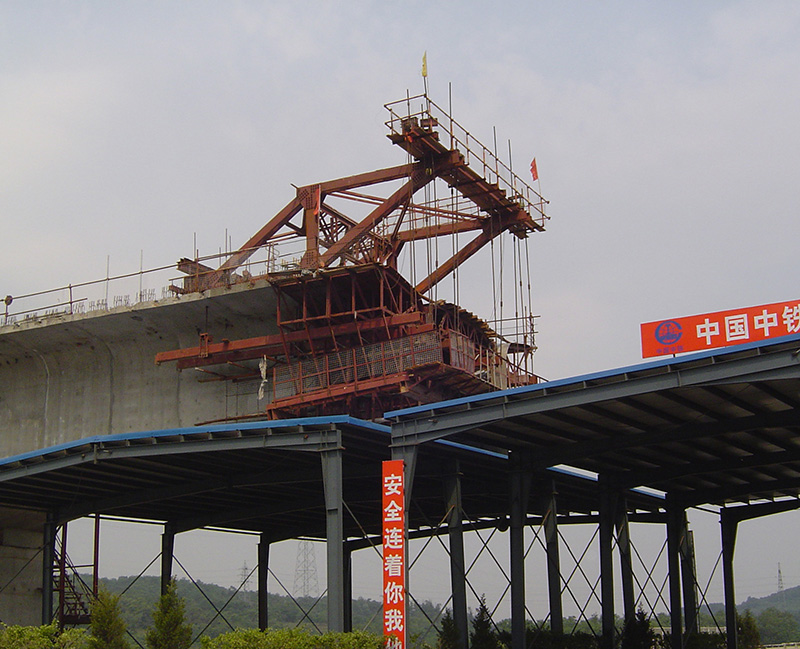 大連掛籃在廠內進行製作,現場安裝後進行預壓,經過檢查掛籃的安全性和檢測導梁撓度,即可立箱梁的模板、綁紮鋼筋、安裝波紋管、澆築砼。每澆完一對梁段,就進行預應力鋪固,然後向前移動掛籃,進行下一段箱梁的澆築,直到懸臂端為止。